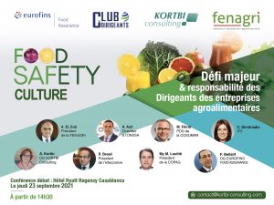 KORTBI Consulting dans le cadre de ses activités et son engagement dans la Sécurité Sanitaire des aliments Co-organise avec Eurofins Food Assurance et ce en partenariat avec la Fédération Nationale de l’Agroalimentaire (FENAGRI) et le Club des Dirigeants (CDD), une conférence inédite au thème « Food Safety Culture : Défis majeurs et responsabilités des dirigeants» qui se tiendra le jeudi 23 septembre 2021 à l’hôtel Hyatt Regency Casablanca à 14h30.